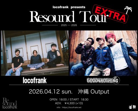 NEWSlocofrank presents Resound tour EXTRA 2026.04.12(日) 沖縄 Output w/ GOOD4NOTHING OPEN 18:00 / START 18:30 前売 4300...