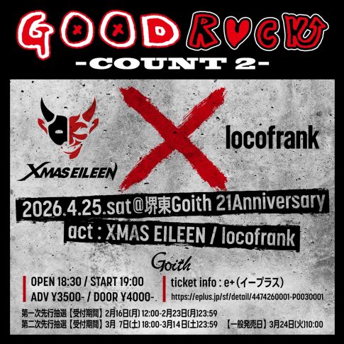NEWS“GOOD ROCK -COUNT 2-“ 2026.4.25(土) 堺東Goith 21Anniversary w/ XMAS EILEEN OPEN18:30 / START19:00ADV¥...